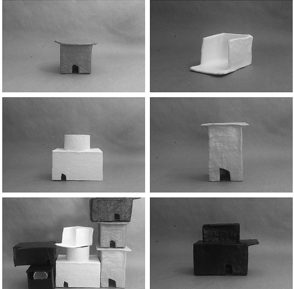 Inspired by my whereabouts and studies in anthropology as well as architecture, These paper mache structures are made from recycled materials, painted with acrylic and finished with a matte coating.